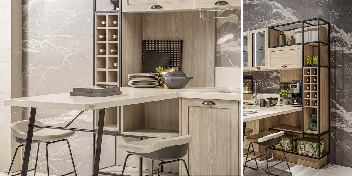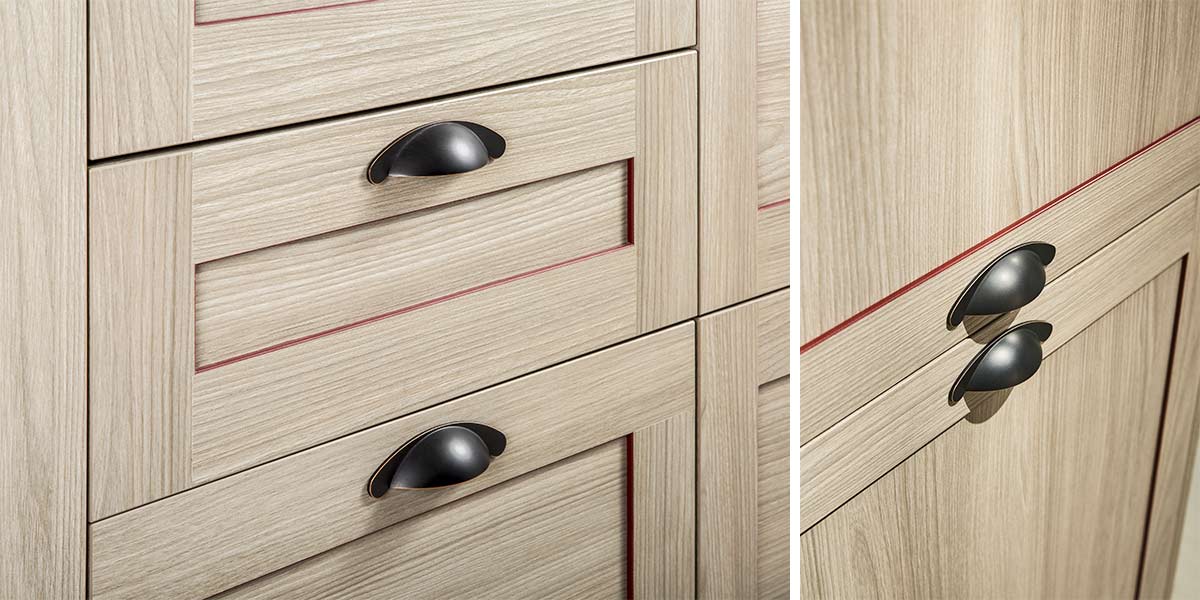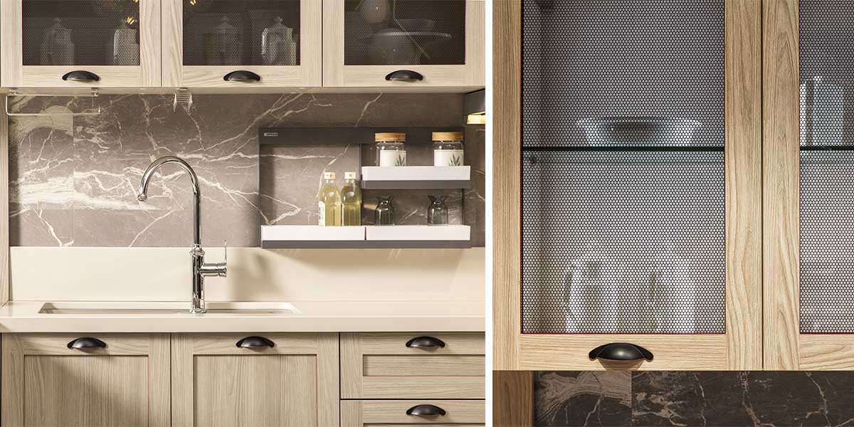 French-style red-line framed door panels make the classic wood grain kitchen cabinets bright and eye-catching. The newly-added aluminum alloy decorative frame makes the kitchen more modern and more diverse in styles. The flower-shaped retro handle is also a unique design highlight.