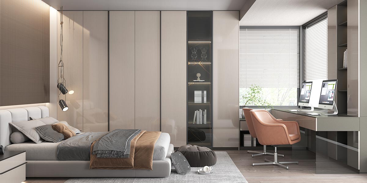 The master bedroom wardrobe is inbuilt design. The wardrobe door panels are soft glossy white UV lacquer finish paired with gilt stone back panels, presenting a soft and warm resting atmosphere. This modern white wardrobe is a handleless design, creating a delicate, elegant, luxurious, and romantic outlook.