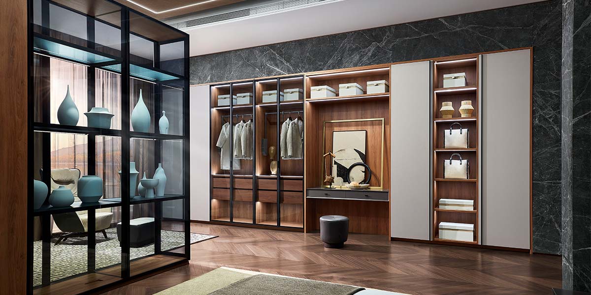This hinged wardrobe design is simple but not dull. The long built-in handles with a distinct pattern upgrade the whole design. The aluminum-framed glass doors make it easy to find out what clothes are inside without opening the doors. Besides, the white-hinged cabinets are open cabinets without doors. It is used to store frequently-used clothes and shoes.