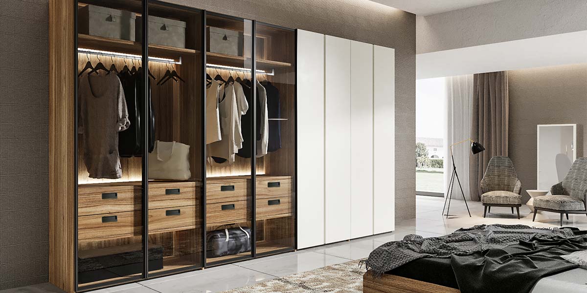 This hinged wardrobe design is simple but not dull. The long built-in handles with a distinct pattern upgrade the whole design. The aluminum-framed glass doors make it easy to find out what clothes are inside without opening the doors. Besides, the white-hinged cabinets are open cabinets without doors. It is used to store frequently-used clothes and shoes.