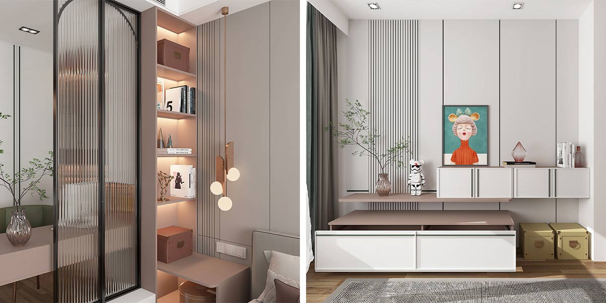 This is a modern minimalist style women’s closet, elegant and charming. With white as the main color, paired with romantic rose pink, it looks romantic and sweet. The wardrobe doors’ metallic handles are as long as the door’s height and are anti-collision, not only look cook and luxurious but also full of love and warmth. There is an extended dressing table on one side of the L-shaped closet, perfect for daily makeup after being dressed.