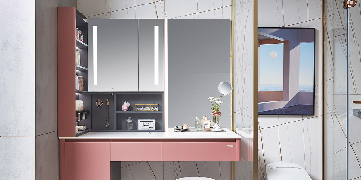 It is a double basin design and suits busy and large bathrooms. It is a modern bathroom cabinet design full of romance in a color of rouge and begonia, coupled with a neat outline. The door panels are in red lacquer finish, moisture-proof, smooth, and delicate. Not only does it look great, but it also has excellent functions.