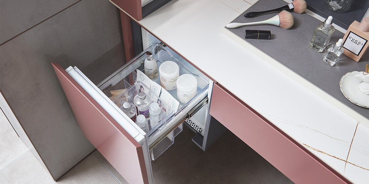 And the hanging metal decorative feet add to the light luxury style. Last but not least, an independent makeup table provides a vast space for makeup, and you can well organize your makeup and skincare tools in the cabinets.