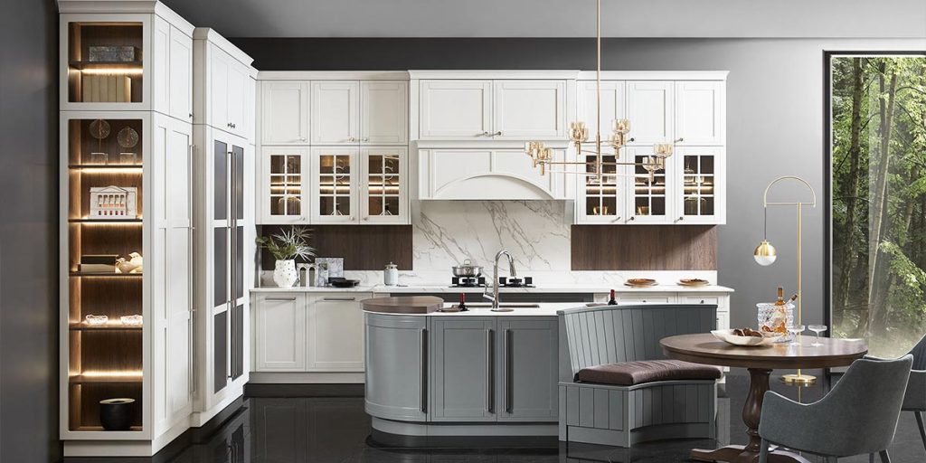 White Kitchen Cabinets This is a contemporary shaker kitchen cabinet set. It has clean lines and a practical design. The cabinet’s doors are soft white PVC finish with brass-colored lines on the frames. They look elegant and unique with the brushed copper handles. There is a lighting system inside the glass wall cabinets and high…