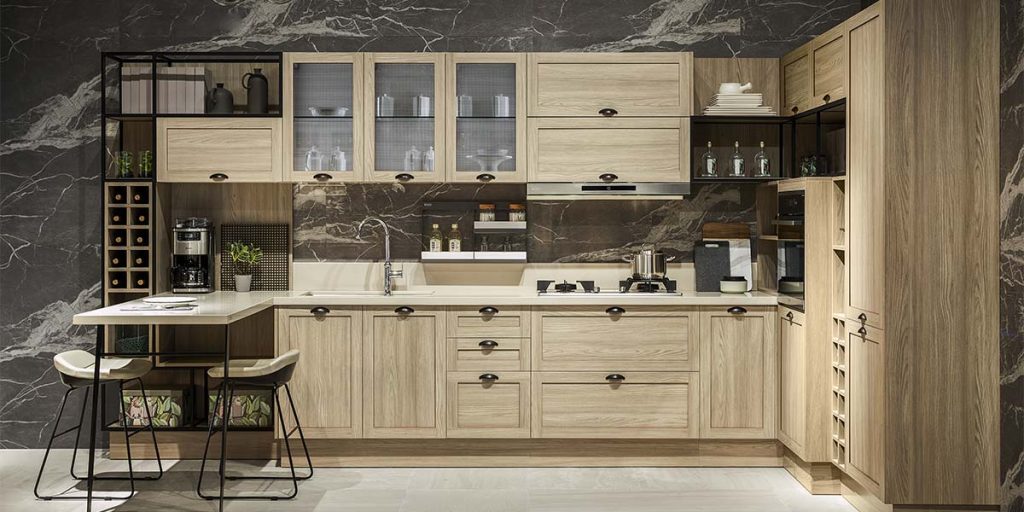Whole Kitchen It is a rustic wooden kitchen cabinet set in a melamine finish. Melamine door is scratch, abrasion, flame, acid- and alkali-resistant. It is a relatively economical and practical door panel material. Melamine material is very suitable for modern and simple-style kitchens. As for the wood tone, the wood color here is natural light…