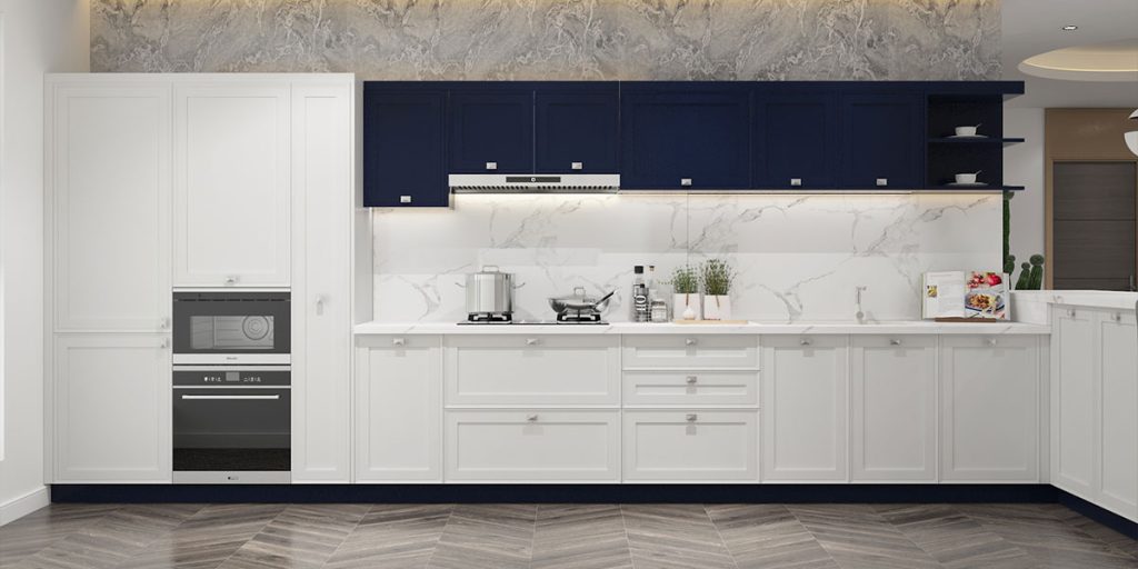 Navy and White Kitchen Cabinets A navy and white color combination kitchen will be an excellent choice for those who love two-tone kitchen cabinets. Balanced by the white base and high cabinets, the navy blue wall cabinets will not be overwhelming in this kitchen design. With white upper cabinets and countertop, the kitchen looks lighter…