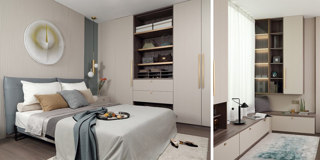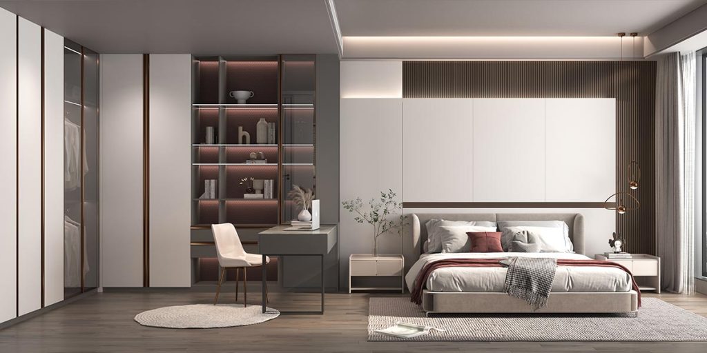 Inbuilt Glossy White Wardrobe The master bedroom wardrobe is inbuilt design. The wardrobe door panels are soft glossy white UV lacquer finish paired with gilt stone back panels, presenting a soft and warm resting atmosphere. This modern white wardrobe is a handleless design, creating a delicate, elegant, luxurious, and romantic outlook. There is a row…