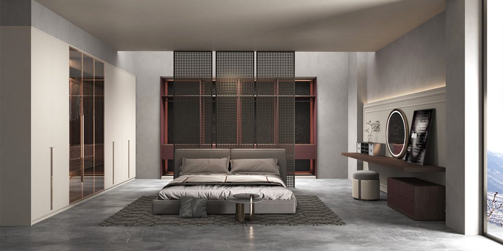 Lacquer Walk in Wardrobe The bedroom and walk-in wardrobe are combined into one, creating the most comfortable and pleasant resting space. The combination of sun red and light grey lacquer finishes shows the elegant Italian home decoration style. The wardrobe cabinets are a built-in design, and the cabinet doors are matched with exquisite metal handles,…