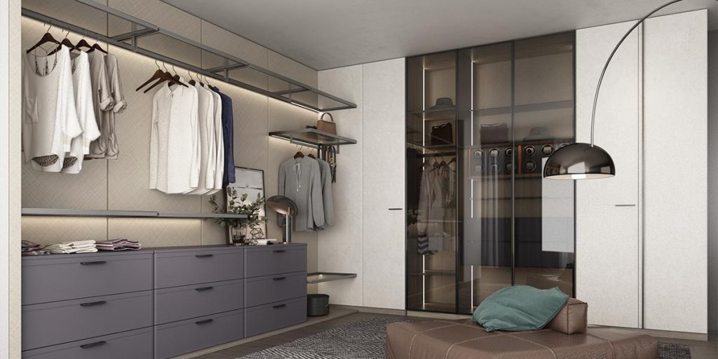 Grey Fitted Wardrobe The fitted floor-to-ceiling wardrobe is in L shaped layout. It is a modern handleless design with clean lines and a scrips outlook. The hinged wardrobe doors are light grey, paired with dark grey open cabinets and an integrated extended computer desk, creating a simple, calming and elegant bedroom wardrobe design. And the…